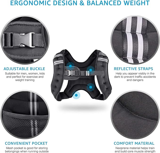 - ERGONOMIC DESIGN & BALANCED WEIGHT - This weight vest is distributed weight throughout your body, including an adjustable strap to prevent slipping and sliding during exercise (WEIGHT NOT ADJUSTABLE)