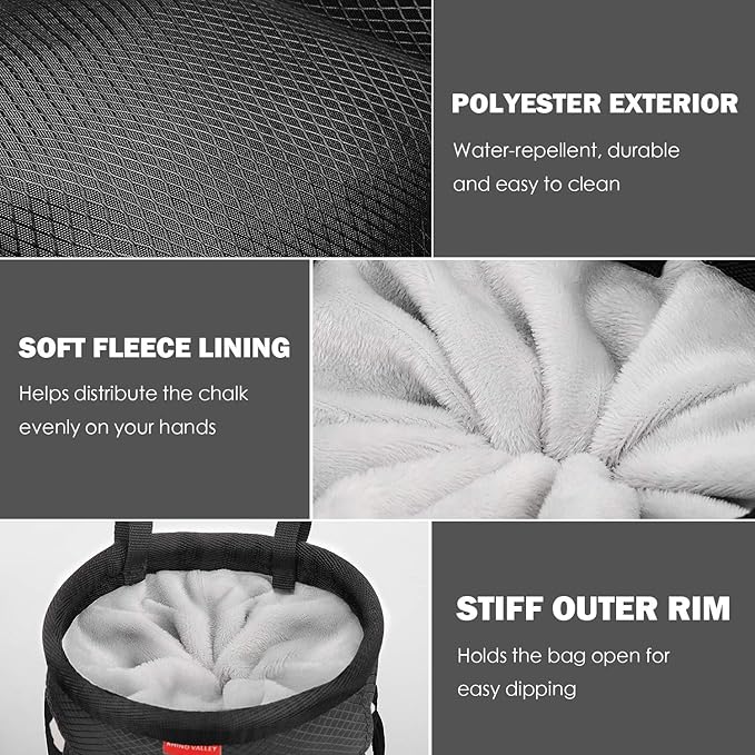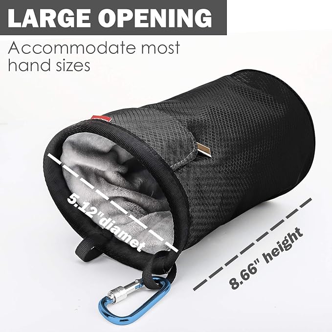 - LARGE CAPACITY & HANDS-FRIENDLY: Large main compartment and opening for chalk, easily accommodate big hands. Drawstring enclosure not only can strengthen the opening to prevent chalk from spilling but also fits hand comfortably.