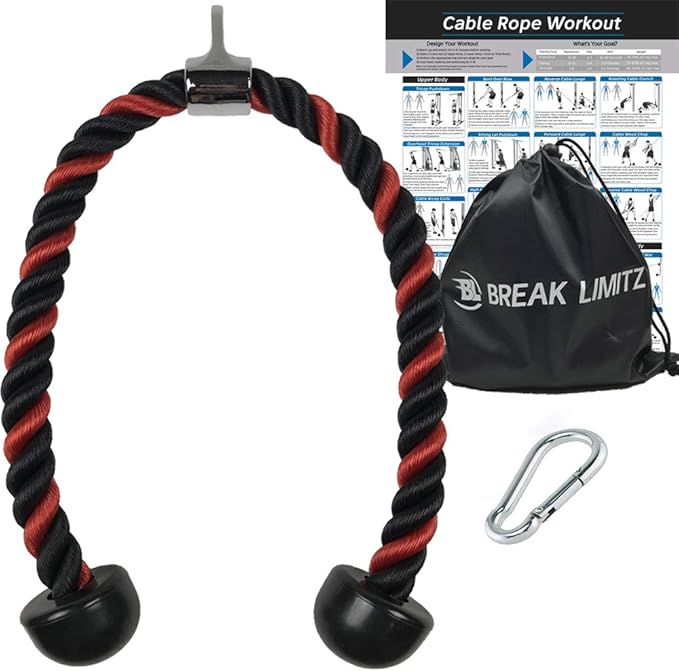 Red Tricep Rope Pull Down & Poster Set | 27 or 36 Inch Heavy Duty Nylon Rope, Chrome Cable Attachment | Professional or Home Gyms | Includes Workout Poster, Snap Hook, Bag
