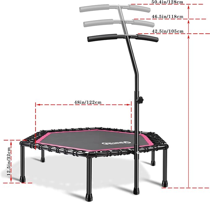 - ✅【Package Details】:This trampoline for adults has and overall size of 48”, 30mm*1.5mm steel frame tube, 6 27mm*1.5 mm legs, 2 handrails( one 30mm*1.5mm, one 25mm*2mm), a heavy-duty pp jumping mat, and 42 bundles of latex filament bungee ropes. A 12KG Net weight; Size of 48”, 32.5mm above ground home trampoline. (when assembled.)