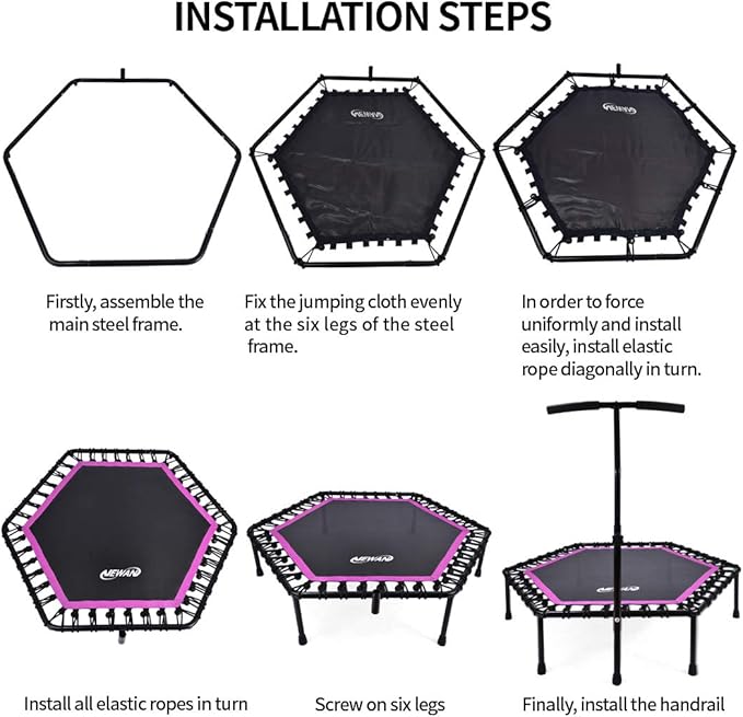 - ✅【Stable hexagon Design】:This fitness trampoline is made of strond pp mesh ,anti-wear and tear resistant hexagon rebounding surface, thick steel pipe which is diameter 30 MM of the specification,6 legs supports user up to 330 pounds(150kg)