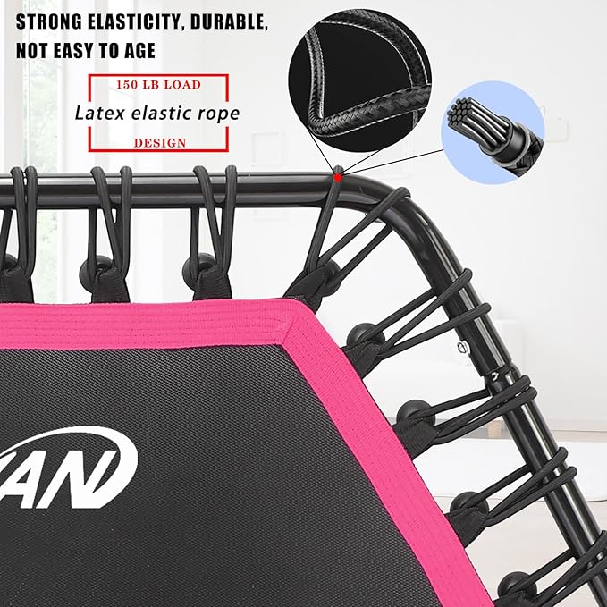- ✅【Covered Bungee Rope System Grantees Safety and Durability】:Newan mini rebounder employs Bungee Ropes as elastic devices which perform sturdily and durably. Bungee Rope is noticeably safer than traditional metal spring, as metal fatigue, metal oxide can be dangerous let alone the huge noise metal spring can make. On the hand,our Bungee Rope fitness trampoline is extremely quite, eliminating sound of friction between metals. 42 bundles of professional bungee rope material are you best choice .