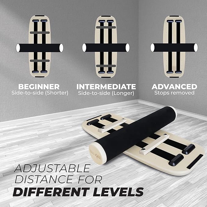 - CUSTOMIZABLE DIFFICULTY: This Balance Surf Board Trainer can be easily adjusted the distance with 2 removable stoppers for beginners (11, 16, and 22 inches) or remove them for advanced riders.