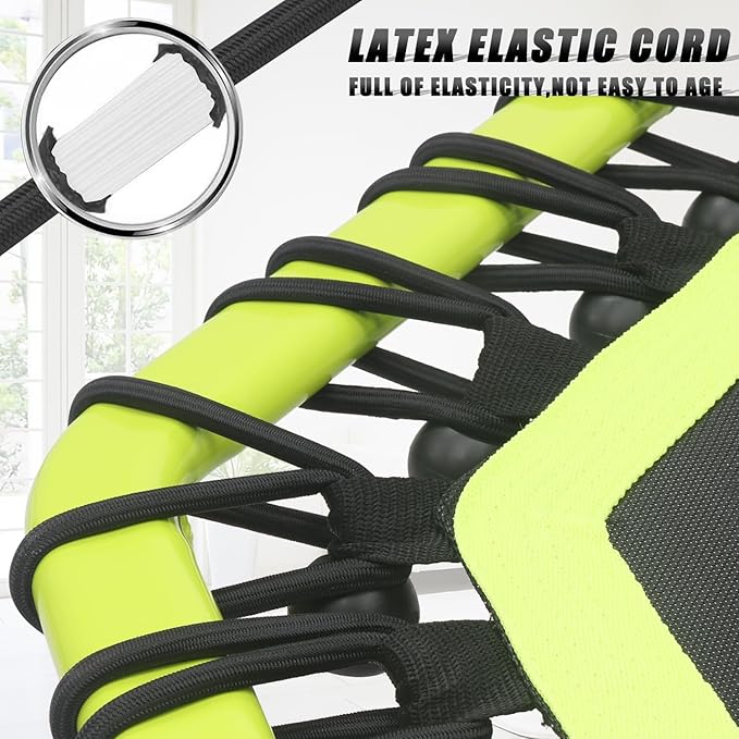 - ✅【Safer, Quieter, Soft but Strong Bounce Back】:The bungee-rope design system with 40 thickened ropes which are 0.32"(8MM) of diameter provides joint-friendly suspension, reduces noise in maximum extent, affords more stability, and gives you a great jumping experience.