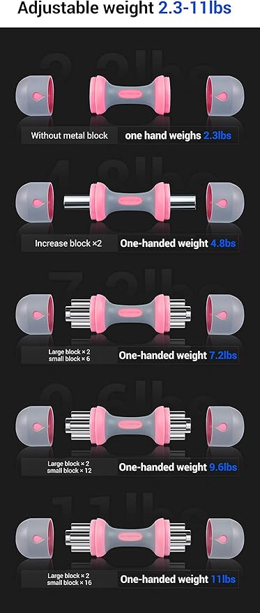 - MULTI-WEIGHT SETTING: The dumbbell alone weighs 2.3 lbs. each. Weight bars are included to allow you to adjust the weight of your dumbbell. There are 16 small and 2 large weight bars per dumbbell. The small bars weigh 0.4 lbs. each and the large bars weigh 1.25 lb. each. In order for the sides to be even, you must add them equally on each side. The lowest weight is 2.3 lbs. and the highest weight is 11.2 lbs. per dumbbell.