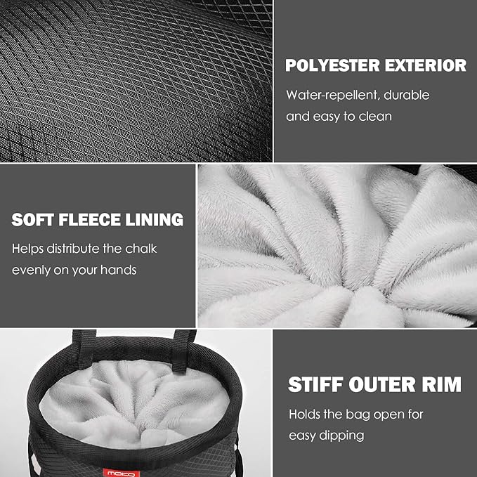 MoKo Rock Climbing Chalk Bag, Bouldering Chalk Pot Bucket with Adjustable Belt & Carabiner Drawstring Climbing Gear