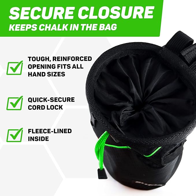 - Adjustable draw cord seals tightly to prevent chalk spills. Keep your car & gear clean with climbing chalk bags that secure your chalk inside the bag. No more wasted weekends & money spent cleaning out messy back seats.