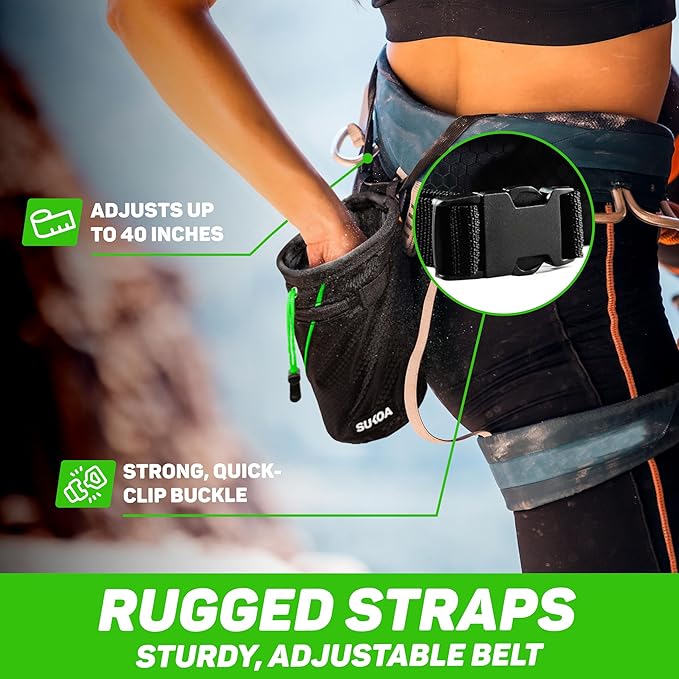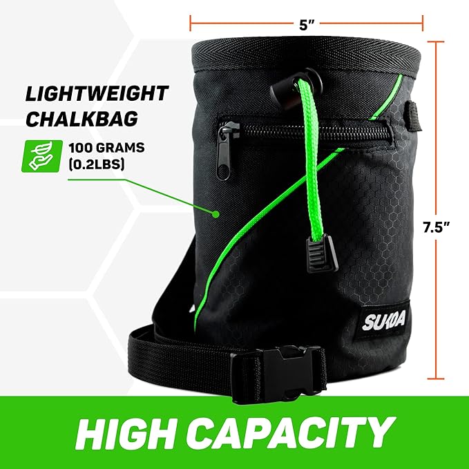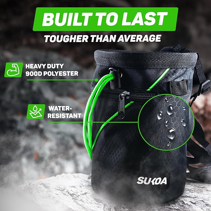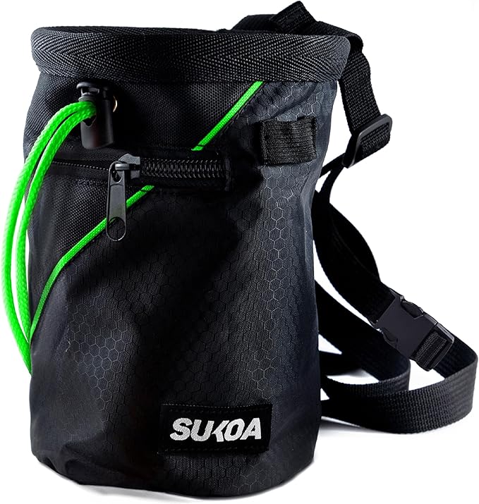- Premium-quality rock climbing gifts. Made from water-resistant material, 900D polyester fabric and premium quality materials, Sukoa Chalk Bag is a tough, rugged bag that will last for years to come.