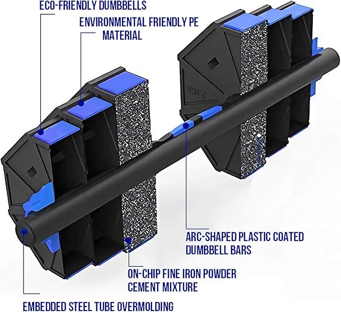 - Durable & Sturdy Design: Vivitory home dumbbell set features a hexagonal design that prevents scrolling and ensures easy storage. Made with polyethylene and EVA resin, with a cement mixture, it is solid and sturdy, ensuring that there is no damage to the floor. The connecting rod is foam-covered to reduce neck compression and relieve fatigue. The non-slip rubber-coated handle provides a firm grip, making it the perfect home weight set