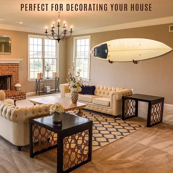 - Minimalist design: the wall rack not only shows your surfboard, but also stores it upon the wall. Therefore, they don’t take up much space, you can have the board displayed even in small room. There are screws for both concrete and stud walls.