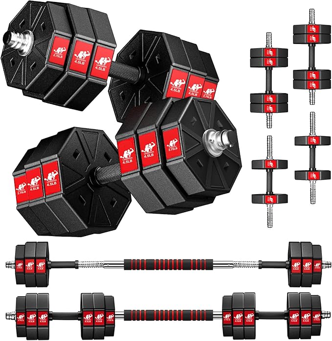 - ✅【SAFE and DURABLE】:This adjustable 3 in 1 dumbbell set is made of durable PE material. Unlike iron dumbbells, it will not scratch the floor. It is very safe and durable. The octagonal design of the Dumbbell plates can prevent it from rolling, More stable. And we upgraded the nut, installed non-slip screws, double fixed, more secure.