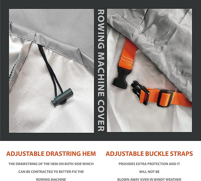 - [Effective fit to the body] -The rowing machine cover is very easy to use and remove. There are buckles on the side and telescopic ropes at the bottom to make the cover fit your rowing machine perfectly, flexible and easy to use