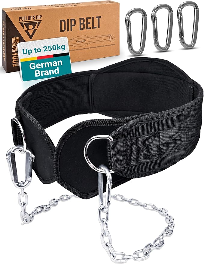 - ✅ EXTREMELY LOADABLE FOR HIGH ADDITIONAL WEIGHTS: The dip belt is extremely heavy-duty due to the high-quality processed and durable nylon fabric and has been tested for loads up to 250 kg. Additional weights can be threaded onto the steel chain and attached to the D-hooks of the Dip Belt with the extra strong steel carabiners.