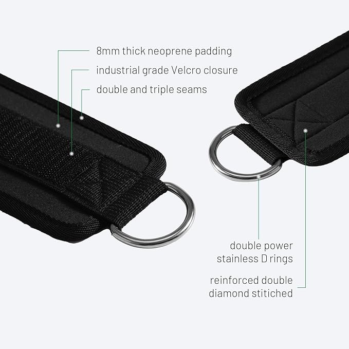 - Durable and Comfortable: Forget about the low quality ankle braces you find at your gym! We use a sweat resistant, best breathable neoprene ankle cuff that’s easier on your body. Lift heavier in comfort with soft padding, rounded cuffs and heavy-duty closure. Two reinforced stainless steel D-rings fastened by double stitching offer security and durability for heavy weighted gym workouts.