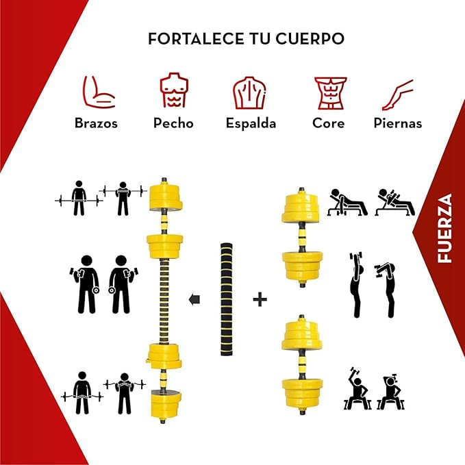 - comprehensive exercise set- our all-in-one dumbbell-barbell set allows you to have a versatile workout. the dumbbells can be used to sculpt your arms, while the barbell setup allows you to practice dead-lifts or squats. this product is perfect for improving overall health or encouraging weight loss. it also helps strengthen the upper body, core muscles, and lower body. the adjustable design makes it easy to stay fit at home.