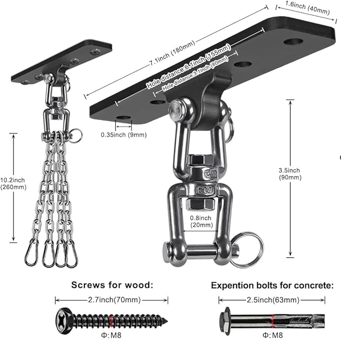 - 🥊Suitable Scenes: Ceiling swing mount with boxing chains for your Boxing, Muay Thai and MMA Training, all mounting screws provided, easy installation.