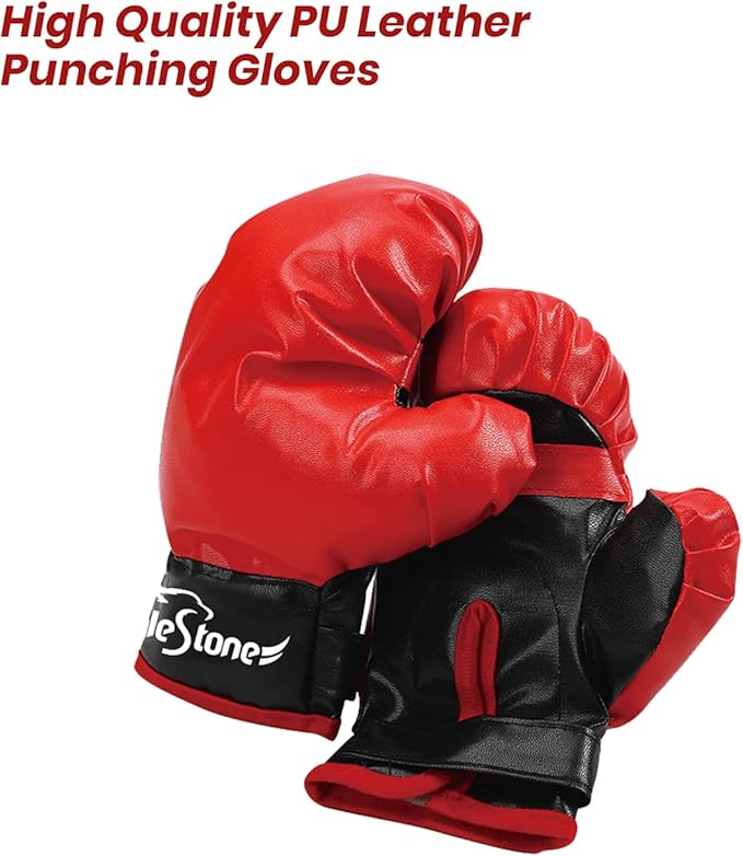 - Eco-Friendly and Durable Material: Constructed from high-quality, eco-friendly PVC, the punching bag is thick, durable, and flexible. It features an eco-friendly PET safety valve and double-layer sealing to prevent air and water leaks. The included boxing gloves are made from comfortable, durable PU leather, measuring 9 * 4.3 inches, ensuring a safe and snug fit for children's hands.