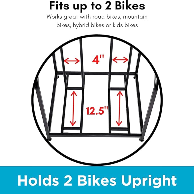 - VERSATILE BIKE STORAGE: Securely holds up to 2 bicycles upright without wall hooks, ideal for garages, homes, and outdoor use. Ideal for road, mountain, hybrid, electric, and kids' bikes.