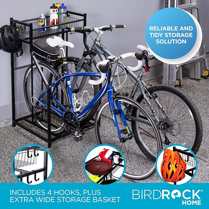 BIRDROCK HOME Bike Rack Garage Storage Floor Stand - Freestanding Organizer for Outdoor Yard - Upright Wall Mount for Scooters, Rakes, Motorcycles, Hoverboards, Gloves - Holds 2 Bicycle - Black