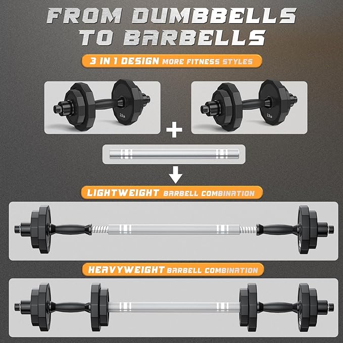- Perfect for Strength Training: Not limited to workout equipment combinations, this dumbbell weights set comes with a connecting rod and can be assembled as a barbell to improve full-body muscle training. Adjustable design helps fitness enthusiasts increase their strength, burn fat, and shape their bodies.Dumbbells offers a better training way than other home gym equipment. Realize your home gym dreams with just a set of dumbbells. Perfect workout dumbbells gift for men and women.