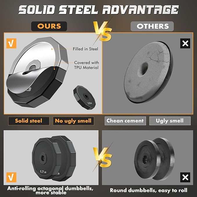 - Upgraded Solid Steel Material with Stable: Compared with the other cement material dumbbells on the market,our adjustable dumbbell set are made of solid steel,thinner,more stable, stable and true weight. Dumbbell weights plate coated is made of TPU material, high security, unbreakable,soundproof and protects the floor. Polygonal design prevents scrolling and makes for easy storage and use.Chrome connecting rod is knurled to ensure a firm grip,while the rubber-coated handle prevents slipping.