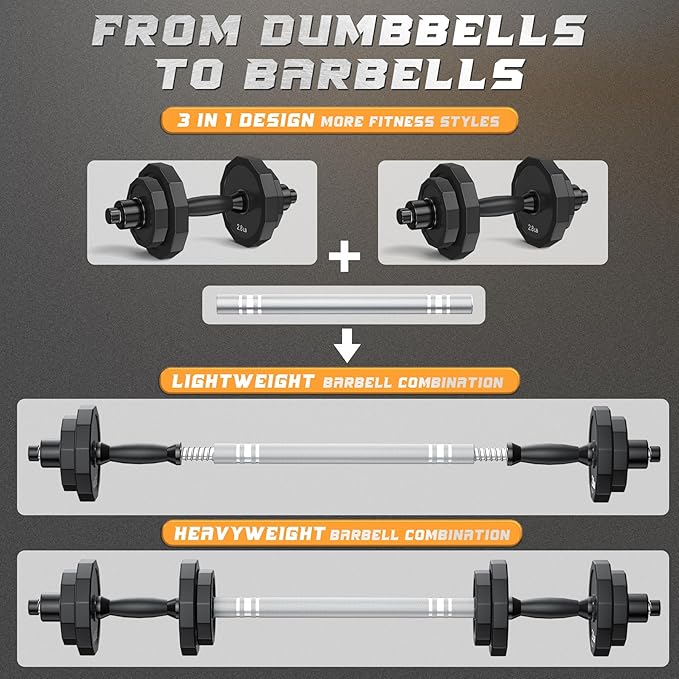 - Perfect for Strength Training: Not limited to workout equipment combinations, this dumbbell weights set comes with a connecting rod and can be assembled as a barbell to improve full-body muscle training. Adjustable design helps fitness enthusiasts increase their strength, burn fat, and shape their bodies.Dumbbells offers a better training way than other home gym equipment. Realize your home gym dreams with just a set of dumbbells. Perfect workout dumbbells gift for men and women.