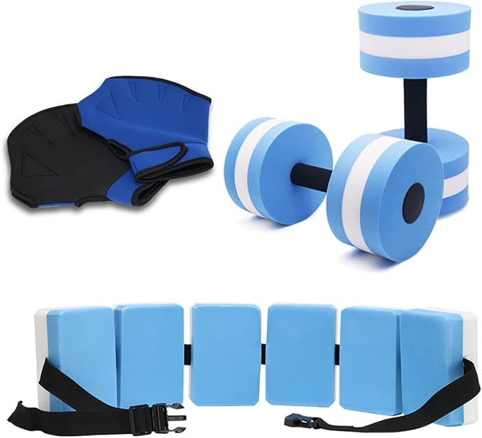 - 【ALL-IN-ONE COMPLETE SET】This Aquatic Fitness Set has all the essential tools you need for aquatic exercise. It includes 2 high-density EVA foam water dumbbells, 1 swimming belt, 2 swimming gloves