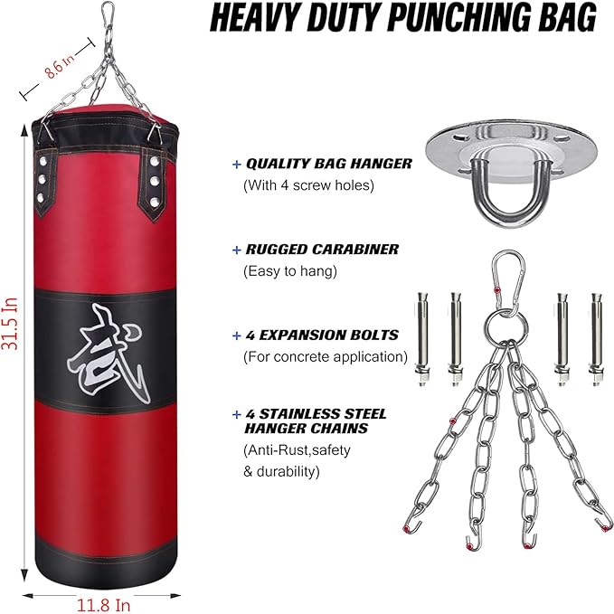 - 【WHAT YOU WILL GET】: This punching bag set includes 1 x empty punching bag, 1 x 4-pannel steel chain, 1 x connecting carabiner, 1 x boxing bag hanger, 1 x expansion screw hook, 4 x expansion screw, 2 x Wrist band. It's the ideal choice for your family or kids to boxing and do Martial Arts, Muay Thai, Karate, Taekwondo, etc. workouts