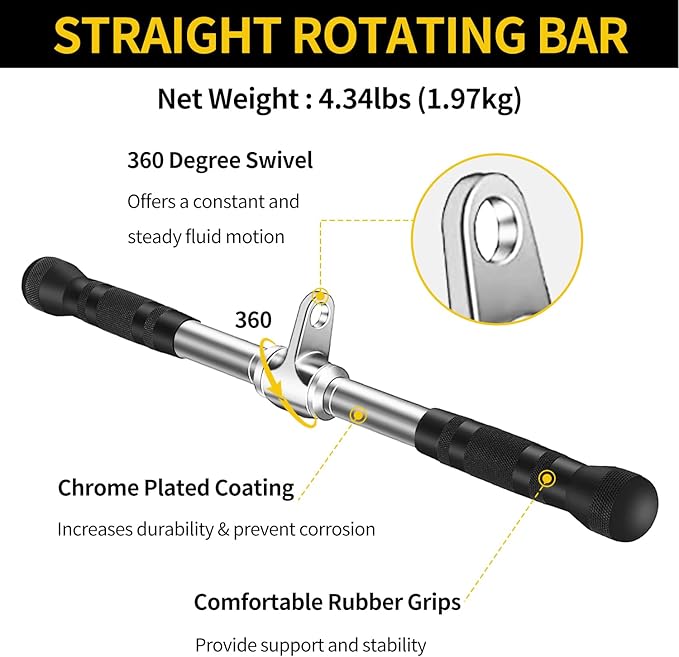 - 【ROTATING STEEL STRAIGHT BAR】 - Great strength steel with rubber handles prevents corrosion, slipping and endure weight up to 880 lbs (3.800N). 18-inch length and 360-degree swivel designed to provide constant and steady fluid motion during workout, fit well in your palm.