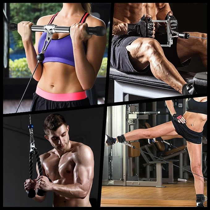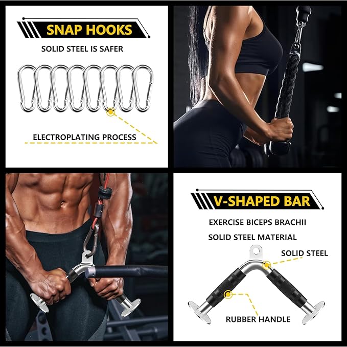 - 【DOUBLE D HANDLE】 - Constructed of high-quality solid steel with chrome coated finish without sharp edges; Ergonomic textured rubber grips increase durability to provide a balanced force to both arms during workout. 360° rotation knuckle and 0.59” hole easy fit any universal gym system for a more versatile, all-purpose workout.