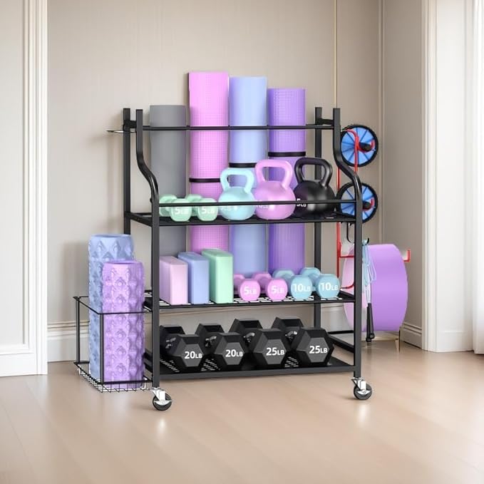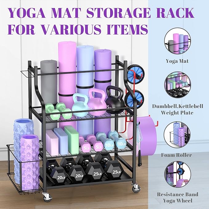 Mythinglogic Yoga Mat Storage Racks,Home Gym Storage Rack for Dumbbells Kettlebells Foam Roller, Yoga Strap and Resistance Bands, Workout Equipment Storage Organizer With Hooks and Wheels