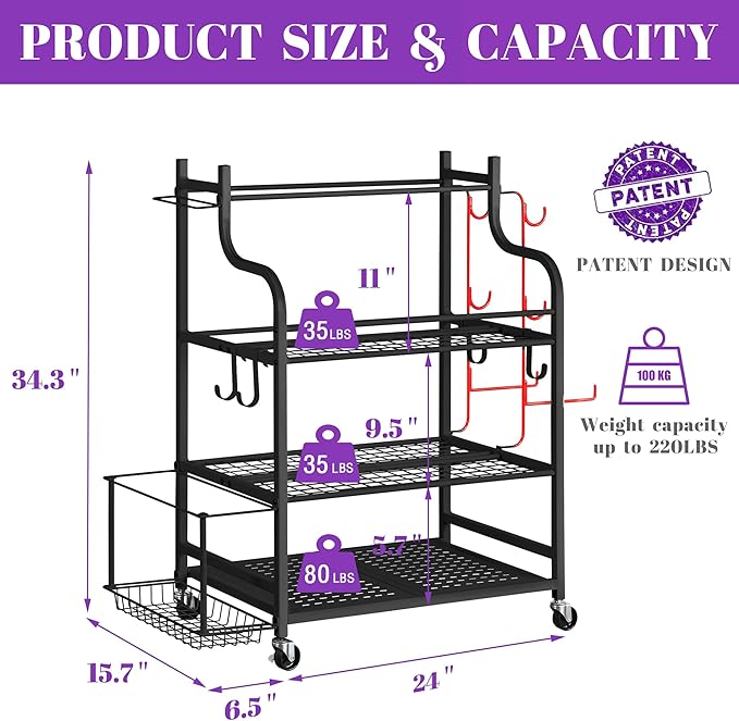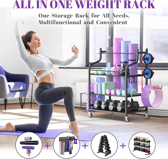 - 【HEAVY DUTY CASTERS】: The home gym storage rack comes with 4 strong 360-degree wheels (2 lockable) and can easy to move indoor and outdoor as well as any places you want to use.