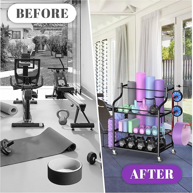 - 【STORAGE VARIOUS ITEMS】: This workout storage organizer can help to store your yoga mat, dumbbells, kettlebells, yoga brick, resistance band,roller wheel, foam roller etc.. Perfect for fan of yoga.