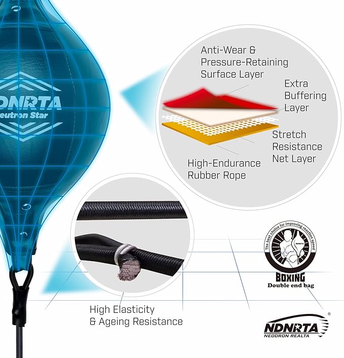 - [Extremely Elastic Rope & Gastight Rubber Bladder] NDNRTA speed bag connects with super elastic and durable rope at both ends with great ductility for long time safe use. Rubber bladder we use inside the punch bag is double layer gastight design with gas nozzle and can be easily inflated with air pump in the package.