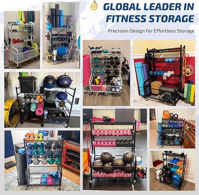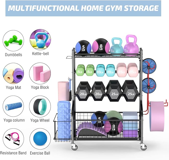 • 【Extra Large Capacity】: Our workout storage rack equipped with 3 layers of dumbbell storage racks, a side basket for yoga mat and foam roller, several side storage hangers for storing resistance band and roller wheels. Bottom storage rack is perfect for storing balls, yoga blocks and other exercise equipment.