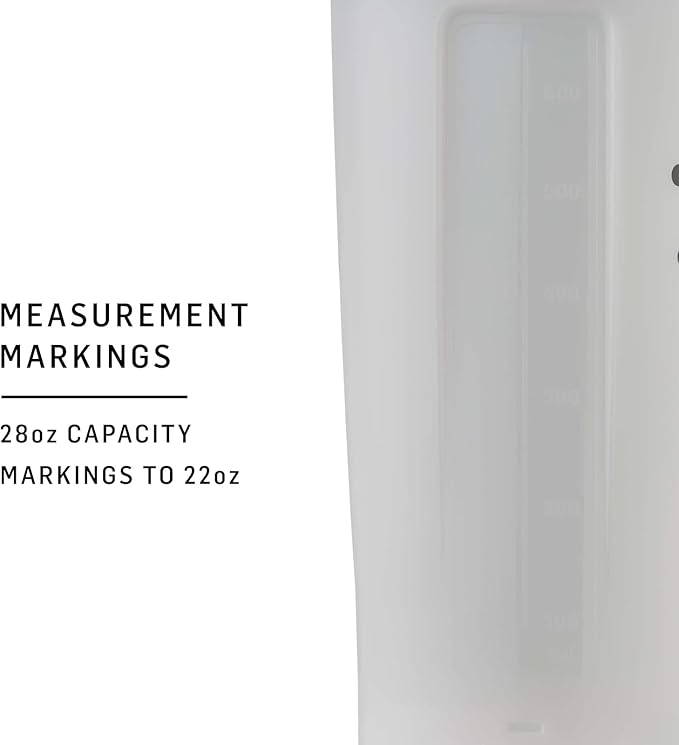 - 28-ounce capacity (note: measurements only go to 22 ounces) classic shaker cup with V2 upgrades, including a rounded base, SpoutGuard, and modern design