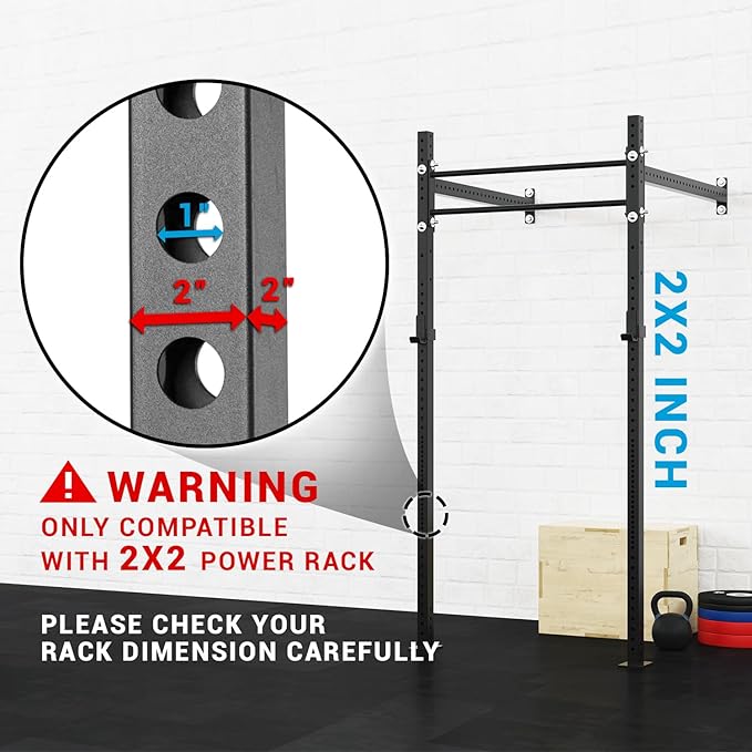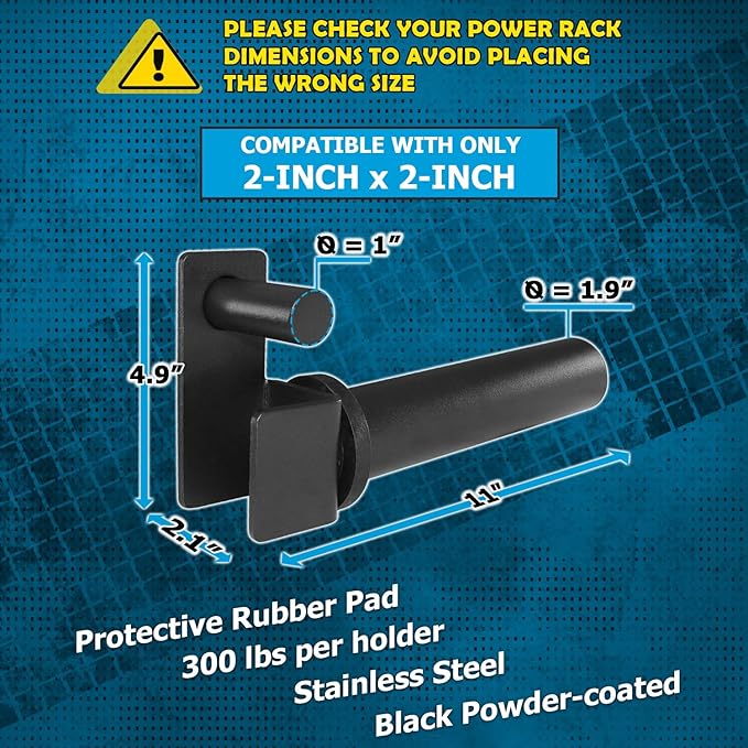 - COMPATIBLE WITH ONLY 2-INCH x 2-INCH RACKS ,1” HOLE AND 2” WEIGHT PLATE, BUT NOT ALL. Please note that this type does not compatible with 3x2” and 3x3” power racks. (IT WOULD BE MUCH APPRECIATED IF YOU CHECK YOUR RACK DIMENSIONS BEFORE MAKE A PURCHASE SO AS TO PREVENT FROM UNCOMFORTABLE RETURNING PROCESS).