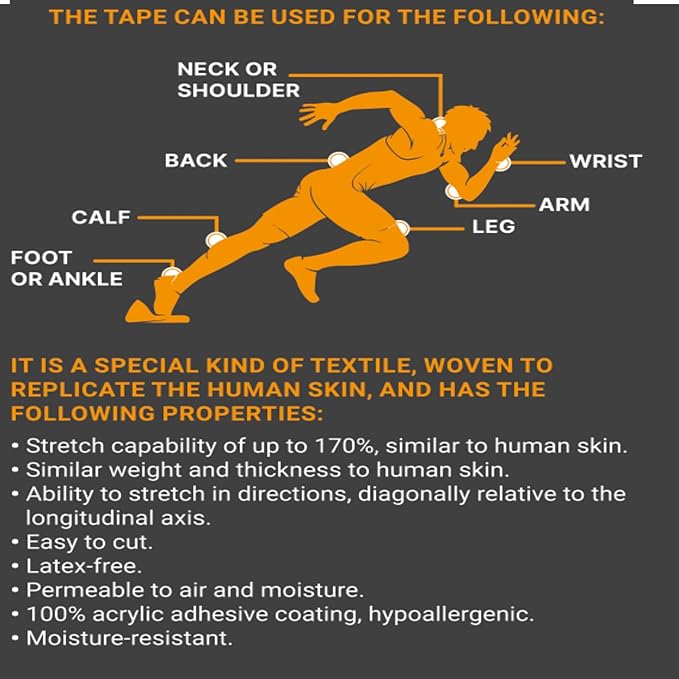 - Water and Sweat Resistant: The tape is designed to withstand water, sweat, and humidity, making it ideal for use during sports and physical activities.