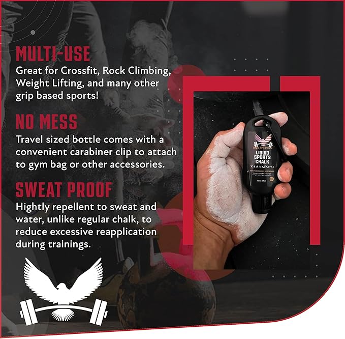 - Mess-Free Liquid Sports Chalk: Enjoy a strong, secure grip without the mess of powdered chalk. IRON AMERICAN Liquid Chalk provides superior grip protection against slips and moisture. Perfect for powerlifting, weightlifting, track and field, any grip based sports.