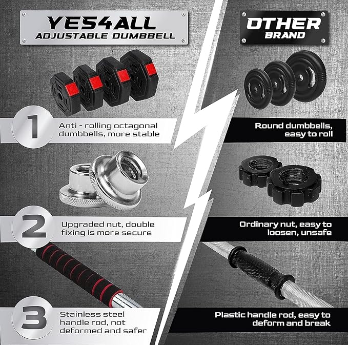 - EASY USE & COMFORTABLE GRIP: Effortlessly assemble and switch between weights, thanks to an ergonomic design that comes with safety features to prevent plates from falling off. Non-slip rubber-coated handle and foam-covered connecting rod is to protect your palms from blistering and easy-to-control dumbbells.