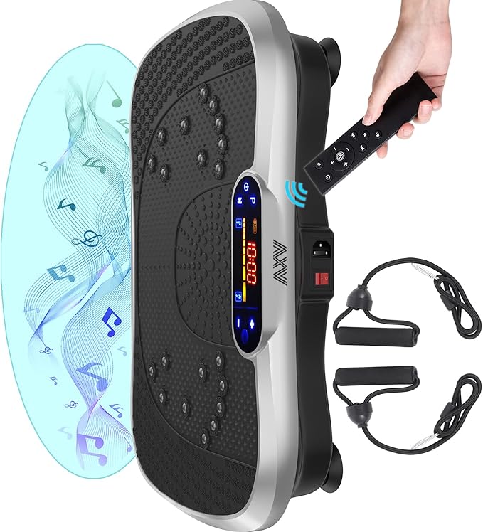 - ✅WHY WE CHOOSE AXV VIBRATION PLATE: Can be connected to phone via BT and used as BT speaker; Magnet health massage function; LED display shows time, speed and burnt fat making your workout visible; Compact size can be used anywhere & easy to carry and store; Anti-slip coating designed;Enhanced upgraded Ergonomic design shell ensures more durability and stability; Comes with Remote control ,Resistance Bands and detailed manual...everything you need.