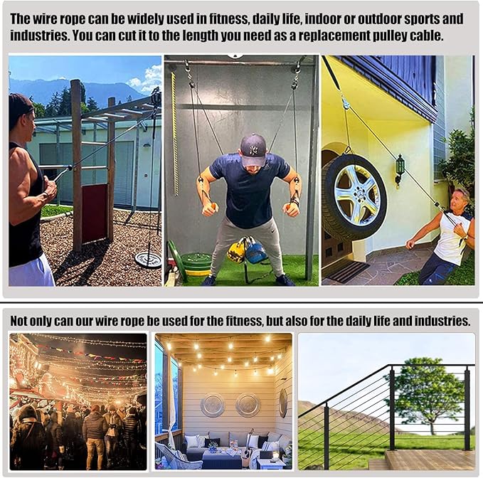- Wide Applications: The wire rope can be widely used in fitness, daily life, indoor or outdoor sports and industries. You can cut it to the length you need as a replacement pulley cable. And use it as the traction rope of the car