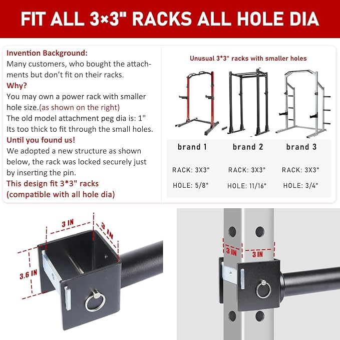 - 💪(New Patent)- Designed to fit all 3x3" power racks (compatible with all hole dia)