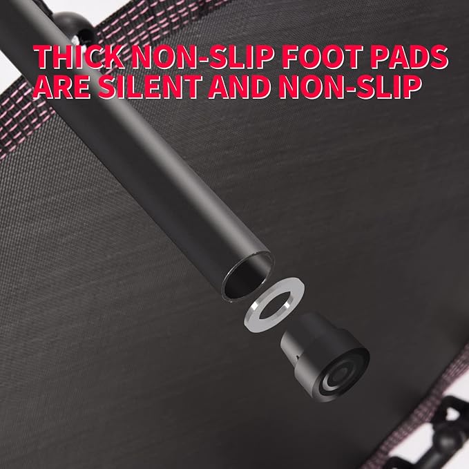 - ✅【Safe and Comfortable 】:Newan 6 legs covered with anti-slid rubber cap,There is a little ingenious washer inside the rubber leg caps that keep the leg itself from cutting through the rubber cap after so many uses and body weight pushing down on the metal leg caps and cutting through,make the trampoline reduces noise in maximum extent and more stable grip for safety and non-slip and protecting the floor.It is quiet so You can watch TV while working on the rebounder.