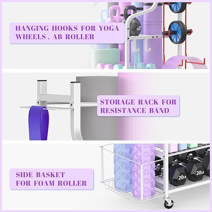 Mythinglogic Yoga Mat Storage Racks,Home Gym Storage Rack for Dumbbells Kettlebells Foam Roller, Yoga Strap and Resistance Bands, Workout Equipment Storage Organizer With Hooks and Wheels