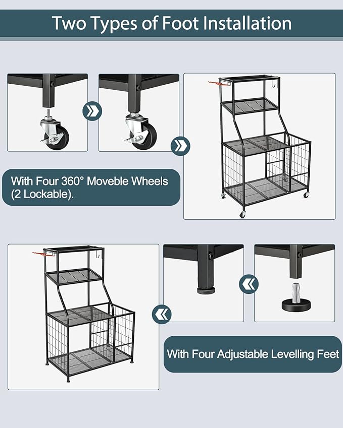 - MOVING WHEELS & FOOT PAD : Home gym storage rack wheels roll well and strong load-bearing capacity, wheels can move and lock it .You can easily move the storage cart anywhere you want. Or assemble 4 foot pads, the stand will be more stable.