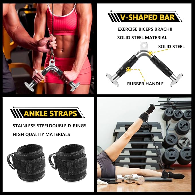 - 【Ankle Straps and Sing D Handle】Gym ankle straps have a D-shaped buckle design for a strong connection. The inner material of PP is comfortable. Gym ankle straps can be used with most standard cable systems. Our Sing D Handle Can focus on training the biceps of the arm. ROTATIONAL KNUCKLE in full 360 degree makes the product nice for doing angle turns or exercises needing an extra angle in addition to pushing exercises.