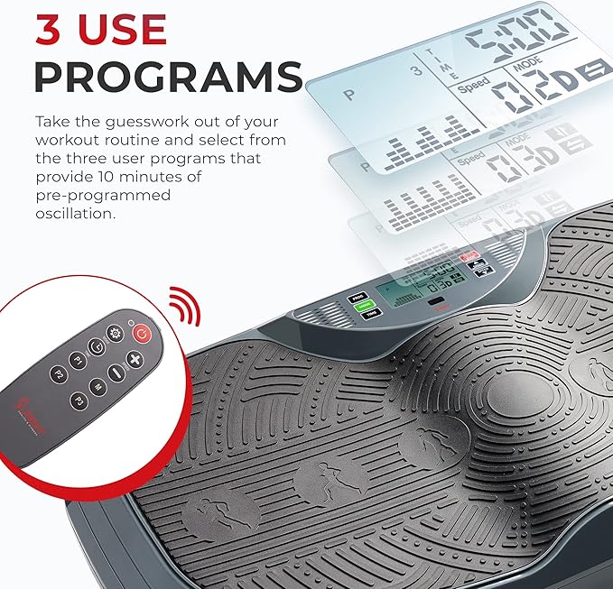 - 【CONVENIENT REMOTE CONTROL】Take control of your workout variety with the easy-to-use remote control. Explore 3 pre-set programs and speed levels tailored to different fitness goals, giving you autonomy over your vibration training sessions.