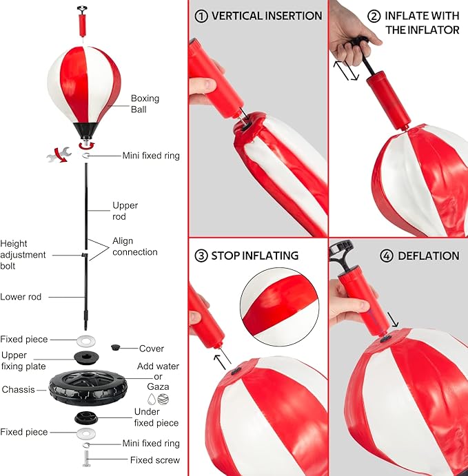 - Easy to Assemble: Our kids punching bag toy comes with an instruction diagram, making it easy to set up. Use the inflatable pump to inflate the boxing ball (please avoid over-inflating it initially). Deflation is also easy when not in use. This punching bag is wonderful for kids, whether it's used outdoors, indoors, in the yard, or on the playground. It can easily accompany you on weekend trips or holidays.
