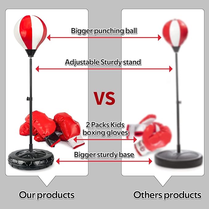 - Premium Quality: Our kids punching bag and 2-pack gloves are made of high-quality, comfortable, and durable PU leather. They perfectly fit the hands of kids aged 5-10. The strong and durable spring allows the boxing bag to bounce back and forth in 180° directions, withstanding all the punching power of the kids. The round base is sturdy and can be filled with water or sand for maximum stability. Please note that this is a kids' toy and not suitable for being violently hit by an adult.